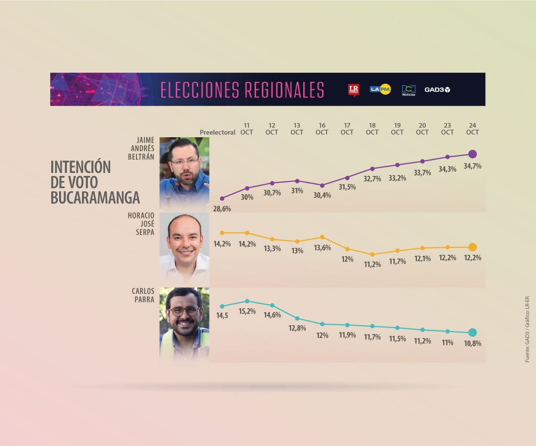 Beltrán registra una intención de voto de 34,7% a corte de 23 octubre. Después de Beltrán, se ubica Horacio José Serpa